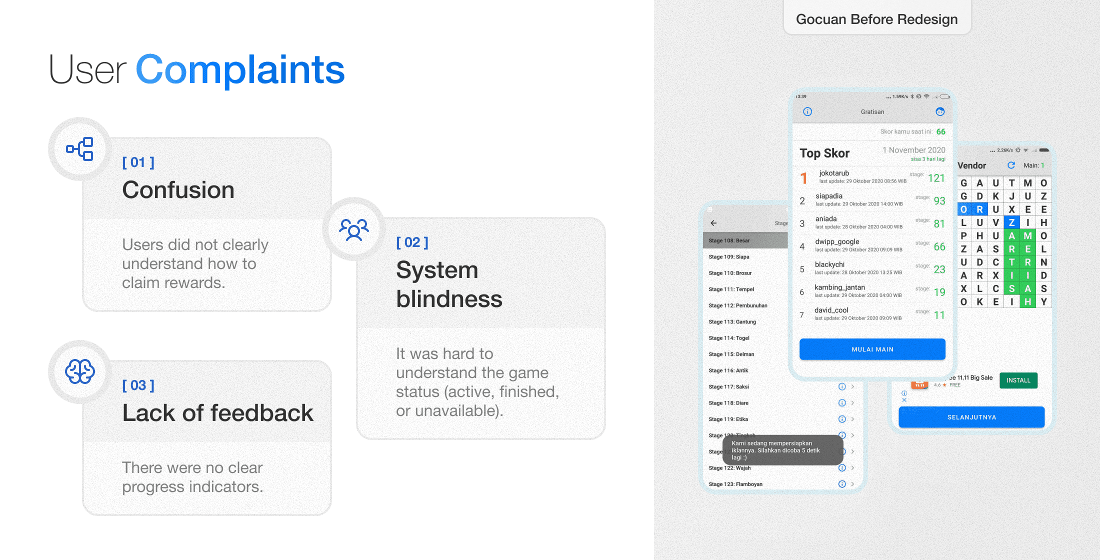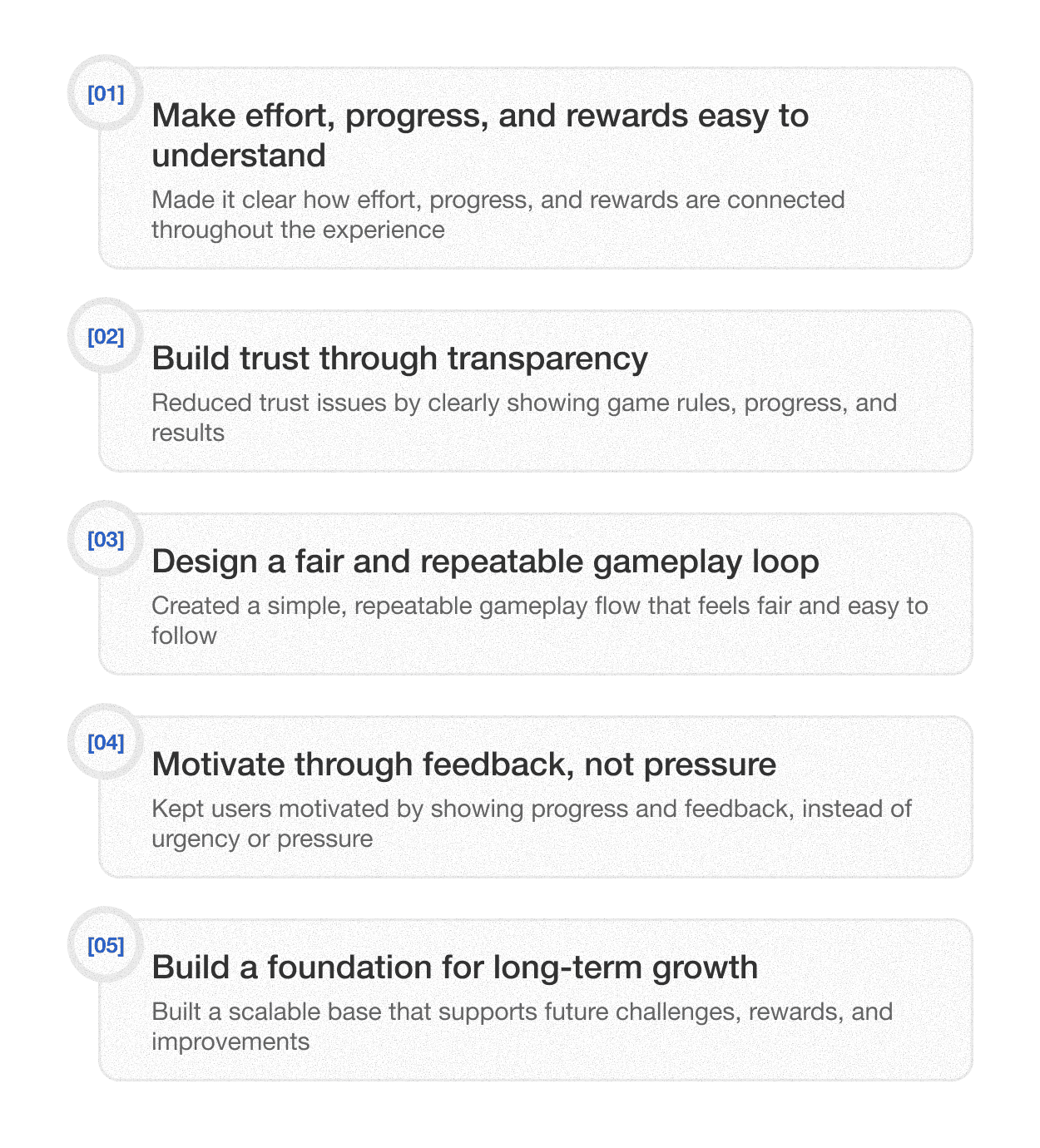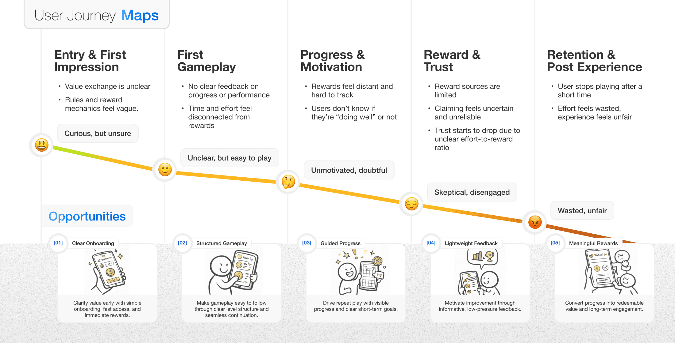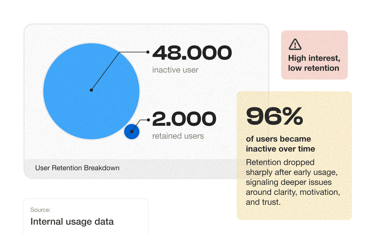 Research showed that low user engagement was caused by behavior and perception issues, not only by visual design. Users stopped playing because they did not understand how close they were to getting rewards and whether their effort really mattered.