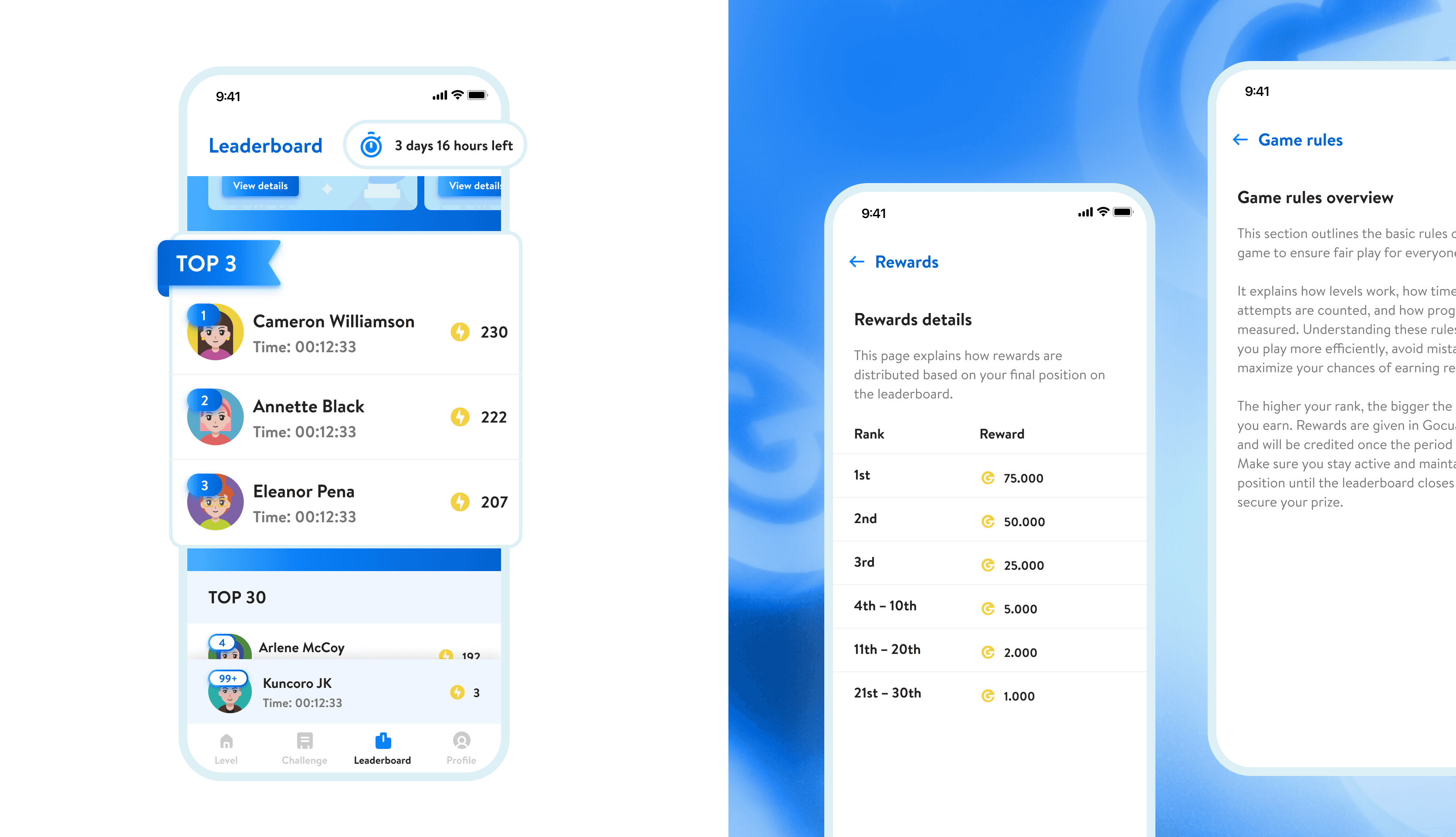 Leaderboards, profiles, rewards, and referrals were unified into a single feedback system. Users can see their performance, track earned rewards, redeem based on preference, and monitor referral progress.